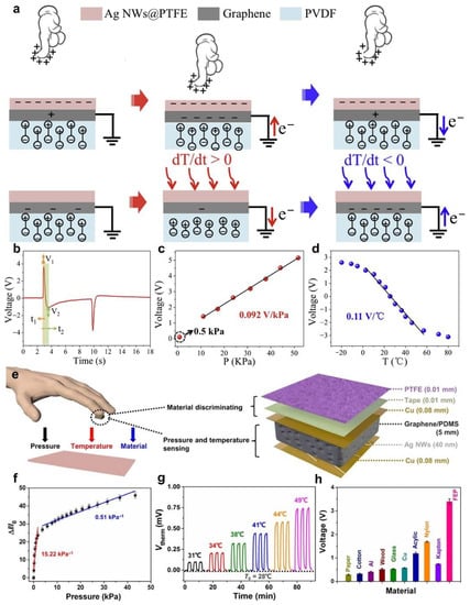In addition to the above combination triboelectric and thermoresistive electrode, the polarization of pyroelectric materials changes as the temperature, which exhibits the advantage of self-powered. Ma et al. [57] designed a self-powered flexible tactile stimulator, which can distinguish pressure and temperature stimuli by the coupling mechanism of triboelectric–piezoelectric–pyroelectric multi-effect. Figure 3a shows the working principle of the device sensing pressure and temperature. The device is designed as a sandwich structure, which is composed of Ag NWs polytetrafluoroethylene (PTFE) film, graphene electrodes and polyvinylidene fluoride (PVDF) from top to bottom. The Ag NWs PTFE film act as the friction layer, which has excellent triboelectric property. The PVDF film has both piezoelectric and pyroelectric effects, which can be used as a temperature-sensitive layer, but also enhances the coupling with triboelectric potential. When the finger touches the Ag NWs PTFE film, compressive strain loaded on the PVDF causes the polarization density to increase, thereby forcing electrons to flow from the ground to the graphene electrode. After releasing the strain, the electrons will return to the ground. This process is the same as the trend of charge flow induced by triboelectric, which has a synergistic enhancement effect. Meanwhile, the PVDF can also respond to the temperature gradient of the tactile stimulator and the finger due to the pyroelectric effects. With the temperature rises, the polarization density of the PVDF reduces with the decreases of the electric dipole moment, so that electrons flow from the graphene electrode to the ground. Conversely, the electrons flow from the ground to the graphene electrode. This process is opposite to the trend of charge flow induced by pressure. Figure 3b shows the response of the device to pressure and temperature coupled stimuli, which continuously produces two different peaks in opposite directions. This is mainly due to the different response time of the device to pressure and temperature stimuli. Based on the principle of response time difference, the tactile sensor can simultaneously distinguish pressure and temperature stimuli without signal interaction. When the pressure is 10.5~52 kPa, the sensitivity is 0.092 V/kPa, and the minimum detectable pressure is 0.5 kPa (Figure 3c). For temperature sensing, the sensitivity is 0.11 V/°C in the range of 10~45 °C (Figure 3d). Although the tactile stimulator responds to pressure and temperature stimuli by using the output voltage signal, which can cleverly use the time difference of response to distinguish these two different external stimuli. In addition, the device also has the advantages of self-powered, multifunctional, and antibacterial, which is expected to be widely used in the fields of soft robotics, artificial prosthetics, and healthcare monitors. Similarly, Wang et al. [58] reported a multifunctional self-powered tactile stimulator based on the coupling mechanism of triboelectric–piezoresistive–thermoelectric multi-effect, which can achieve the sensing of pressure, temperature, and materials. The tactile stimulator consists of a multilayer structure superimposed with a PTFE film as the friction layer, a Cu sheet coated with Ag NWs as the electrode, and a spongy graphene/PDMS composite as the response element for piezoresistive and thermoelectric effects (Figure 3e). Based on the piezoresistive effect, the resistivity of the spongy graphene/PDMS composite changes with pressure. Therefore, it can respond to different pressure levels through the current measurement. The pressure sensitivity of the device is defined as S = (ΔI/I0)/ΔP, where I0 is the initial current when the pressure is released, ΔI is the current difference, ΔP is the pressure difference. The device has a high sensitivity of 15.22 kPa−1 for pressure sensing in the range of 0~5 kPa, and the sensitivity decreases as the pressure increases, as shown in Figure 3f. Based on the thermoelectric effect, the device can respond to temperature changes by detecting voltage signals. The voltage is defined as Vtherm = ST × ΔT, where ST is the Seebeck coefficient, ΔT is the temperature gradient of the device. The temperature response range of the device is 25~60 °C, and the temperature coefficient is 35.2 μV/K. As the temperature gradient increases, the voltage signals gradually increase, as shown in Figure 3g. Based on the triboelectric effect, the voltage signals changes with the contact materials, so that the material properties can be inferred by analyzing the corresponding signals (Figure 3h). This research can simultaneously realize pressure and temperature sensing by integrating different mechanisms to generate different electrical signals, which provide a new approach for multifunctional sensors and have potential applications in wearable electronics and robotics.