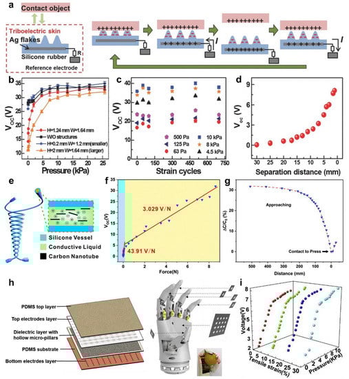 Besides the above pressure and temperature sensing, the proximity sensing is also very important for tactile perception, which can detect the motion information of the object without contacting the measured object. Due to the coupling effect of triboelectrification and electrostatic induction, the TENGs as triboelectric skins can not only realize pressure sensing, but also achieve proximity sensing, the working mechanism of which is shown in Figure 4a [59]. The triboelectric skins use percolating silver-flake network as the extendable electrode, and rubber as the friction layer with pyramidal microstructure surface. In the initial state, the external object contacts with the friction layer, electrons transfer from the object surface to the friction layer surface owing to the different electronegativity. At this time, the positive and negative charges are balanced, and there is no electron flow in the external circuit. With the gradual separation of the object, free electrons flow from the embedded electrode to the ground, thereby generating the current until the maximum distance between the two is reached. When the object approaches again, free electrons flow from the ground to the embedded electrode, thereby generating the opposite current and until full contact to form a complete electricity generation cycle. In the pressure sensing mode, different pressure makes the contact area different, resulting in different open-circuit voltages. Meanwhile, it is closely related to the size of the pyramidal microstructure, and the triboelectric skins with a middle-sized pyramidal microstructure (H = 1.24 mm; W = 1.64 mm) show an ultra-high sensitivity of 0.29 kPa−1 under the low pressure (Figure 4b). The design of the pyramidal microstructure effectively expands the pressure sensing range and improves the sensitivity, which provides a good strategy for the improvement of device performance in the future. Moreover, the open-circuit voltage shows good stability in different strain cycles (Figure 4c). In the proximity sensing mode, different separation distances lead to variations in the electrostatic field on the friction layer surface, which corresponds to different open-circuit voltage (Figure 4d). This multifunctional active perception expands the application in the field of human-machine interactions. By coupling triboelectric and capacitance modes, Yuan et al. [60] reported a liquid–polymer tubular TENG that can realize pressure and proximity sensing in multiple modes. The friction layer of the device is a hollow tube made of silicone rubber, and the electrode is a mixture of conductive liquid and carbon nanotubes filled in the hollow tube, as shown in Figure 4e. Based on triboelectrification and electrostatic induction, the device can be used as a typical TENG of the single electrode mode. In the low force range, the device shows a high sensitivity of 43.91 V/N (Figure 4f). As the force increases to approximately 10 N, the sensitivity value drops to 3.029 V/N. When the two tubes are stacked together, the cross area is equivalent to a capacitor, which can also realize pressure and proximity sensing. Although the maximum sensitivity of the force in capacitance mode is only 18.81 N−1, the maximum distance of proximity sensing can reach 400 mm (Figure 4g). Furthermore, in order to further realize the proximity sensing of the robotic hand, a stretchable sensor array with two modes of TENG and capacitance is developed, as shown in Figure 4h [61]. The sensor array uses a cross-grid liquid metal layer as electrode, and silicone rubber as dielectric layer and packaging material, which leads to the whole device being highly stretchable. This cross-grid structure enables the device simultaneously to realize TENG mode and capacitance mode. Under the action of TENG mode, the device can identify the position and pressure of the measured object by detecting the output voltage of the device and shows a high sensitivity of 0.68 V/kPa under the low-pressure range (<3.5 kPa). Under the action of capacitance mode, the proximity sensing and pressure sensing can be realized at the same time by monitoring the capacitance change of the device. The geometry design of electrode and the microstructure design of dielectric layer can improve the proximity sensing performance and pressure sensing sensitivity, respectively. Meanwhile, the hollow micro column microstructure designed in the dielectric layer can distinguish pressure and tensile strain stimuli (Figure 4i). This is because the thickness of the dielectric layer becomes smaller after stretching, which leads to increased electrostatic induction. Moreover, the device still shows excellent reliability under multiple cycles with tensile strain of 30%. Based on this design idea, the device can also be applied to proximity sensing and tactile perception of other parts of the robot.