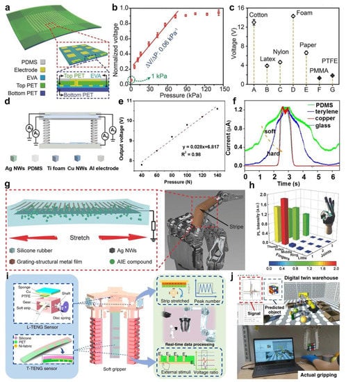 - Jin, T.; Sun, Z.; Li, L.; Zhang, Q.; Zhu, M.; Zhang, Z.; Yuan, G.; Chen, T.; Tian, Y.; Hou, X.; et al. Triboelectric nanogenerator sensors for soft robotics aiming at digital twin applications. Nat. Commun 2020, 11, 5381. [Google Scholar] [CrossRef] [PubMed]