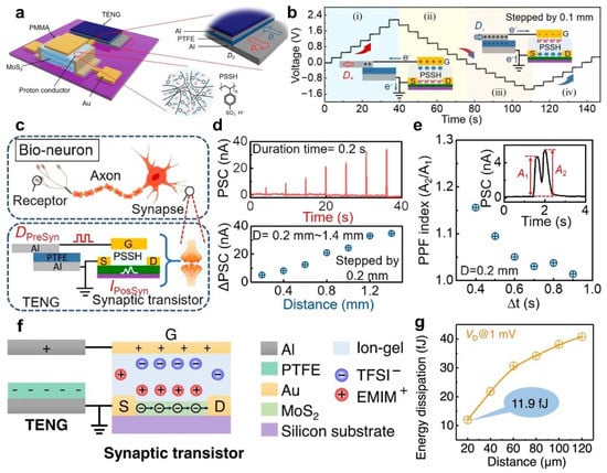 In addition to the aforementioned semiconductor material, two-dimensional semiconductor materials have also been used as channel materials for EGTs [72,73,74,75,76,77,78,79,80]. Among them, MoS2 has remarkable charge carrier mobility and tunable bandgap, which has attracted special attention of researchers [81,82,83,84]. Figure 7a shows a versatile MoS2 transistor actuated by sliding-mode TENG, which can modulate its electrical properties through triboelectric potential [85]. With the change of the relative displacement, the output characteristics of the TENG shows a stable periodic change, as shown in Figure 7b. The change process can be divided into four states. (i) when the relative displacement of the TENG is D+, the output voltage gradually increases from 0 to 2.15 V, and a positive triboelectric potential is formed at the MoS2 transistor gate. (ii) As the relative displacement of the TENG returns to the initial position, the output voltage returns from 2.15 to 0 V. (iii) Conversely, when the relative displacement of the TENG is D−, the output voltage gradually decreases from 0 to −1.36 V, and a negative triboelectric potential is formed at the MoS2 transistor gate. (iv) As the relative displacement of the TENG returns to the initial position again, the output voltage returns from −1.36 to 0 V. Under the actuating action of the TENG, the MoS2 transistor has three working states: flat-band state, accumulation state, and depletion state. The MoS2 transistor uses a proton conductor as an electrolyte, which can quickly migrate/polarize under the action of electric field and form a high capacitance EDL compared with other ions with larger size and volume [86,87]. In an analogy sensory neuron system, the TENG can be used as a tactile stimulator to induce the presynaptic signals, and the MoS2 transistor can be served as a postsynaptic device to output corresponding postsynaptic current (PSC), as shown in Figure 7c. Under the action of a displacement pulse, the PSC increases with the increase of the displacement distance (Figure 7d). Under the action of two continuous displacements, the PSC peak induced by the second displacement is greater than that induced by the first displacement (Figure 7e). The output characteristics of the MoS2 transistors are highly similar to the synaptic behavior of biological. Although TENG as a tactile stimulator can effectively reduce the power consumption by replacing the gate voltage of the synaptic device, there is still a large gap compared with the consumption of only 1~100 fJ each synaptic event in the brain. Therefore, it is still necessary to further reduce the power consumption of the synaptic device, which is of great significance to the development of the synaptic device. Sun et al. [51] proposed a triboelectrification-activated artificial afferent neuron at femtojoule energy (Figure 7f). The triboelectrification activation can induce the migration of anion/cation and form the EDL in the ion gel, which can effectively transfer the Fermi level of MoS2 channel to achieve synaptic plasticity. The migration process of the anion/cation in the EGT is crucial for mimicking the working process of biological synapses. The source-drain tunneling current can be effectively reduced and the transport properties in the channel can be effectively improved due to the atomic thickness and wide band gap of the MoS2 [83]. Therefore, the MoS2 channel still maintains excellent output characteristics and synaptic plasticity when the drain voltage drops to 1 mV, and the power consumption of this system can be greatly decreased to 11.9 fJ per spike (Figure 7g). The above-mentioned studies show that the EGTs actuated by TENGs as tactile stimulators have broad application prospects in the fields of low power bionic electronic devices and artificial neural networks in the future.