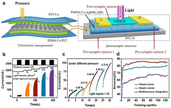 Moreover, it has been recently reported that optoelectronic synaptic transistor based on perovskite materials can also be used for the synaptic plasticity due to the excellent light absorption of perovskite materials. Figure 9a shows a multisensory integration nervous system integrated by flexible TENG and the photosynaptic transistor with perovskite (Cs2AgBiBr6) quantum dots, which can simultaneously realize haptic and iconic perception recognition [93]. The flexible TENG can be used as skin receptor, while the quantum dots act as retina receptors, which can convert haptic and optical stimuli into presynaptic electrical signals (pre-synaptic neurons 1 and 2). Then the channel current of the photosynaptic transistor is obtained by the tuning of the bottom gate (pre-synaptic neuron 1) and floating gate (pre-synaptic neuron 2) of the photosynaptic transistor. Under the action of a single tactile stimuli, the triboelectric potential generated by the TENG can induce the photosynaptic transistor to form a gate electric field, which makes the quantum dots able capture charge carriers in the semiconductor and play a role in tuning the channel current. With the disappearance of the electric field, the charge carriers can stay on the quantum dots floating gate for a certain time, which makes the photosynaptic transistor display synaptic characteristics of PPF and LTM. When the time interval between two successive tactile stimuli enhances from 20 ms to 40 s, the PPF index reduces from 168% to 102%. Moreover, under the action of 30 continuously touch pulses, the channel current increases with the enhance of light intensity (Figure 9b). Under the action of a single optical stimuli, the photoinduced excitons generated by quantum dots can be quickly separated to construct built-in electric field so that the quantum dots are able to capture the charge carriers. By the same principle, when the time interval between two successive optical pulses enhances from 20 ms to 20 s, the PPF index reduces from 136% to 102%. Meanwhile, the channel current can be adjusted by different pressure under 30 continuously optical pluses (Figure 9c). Further, the recognition accuracy of the multilayer perceptron neural network is 68.02%, 80.55% and 86.83% under single iconic sense, haptic sense, and multisensory integration after 130 training epochs, respectively (Figure 9d). These results indicate that multisensory integration effectively improves the recognition accuracy of the external environment. This work shows that the integration of TENG and photosynaptic transistor is of great significance for the development of interactive neuromorphic computation.