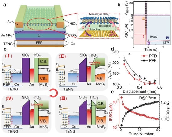 In addition to the above synapse transistors, a tribotronic floating-gate neuromorphic transistor has been proposed by combining the silicon-based field effect transistor and integrated TENG, which can also realize multiple synaptic plasticity by external stimulation. Figure 10a [94] illustrates the schematic diagram of the tribotronic floating-gate neuromorphic transistor. There are TENG parts on the bottom of the transistor, and the friction layer composed of the Cu electrode and fluorinated ethylene propylene (FEP) can continuously contact and separate with the Cu film at the bottom of the transistor under the action of external force. The gate electrode and the dielectric layer of the transistor are composed of heavily doped Si and 300 nm thick SiO2, respectively. Au nanoparticles deposited on SiO2 dielectrics are used as floating gate layer of the transistor, which synergistically functionalizes with the 10 nm thick HfO2 tunneling dielectric layer to achieve the charge trapping/detrapping process [95]. The MoS2 transferred on HfO2 is used as the channel of the transistor. The Au nanoparticles can obtain the induced charge carriers under the interaction of the triboelectric potential and the MoS2 channel, and progressively decay back under the action of the tunnel layer. This process can effectively simulate the transfer of neurotransmitters, and more sophisticated mechanoplasticized synaptic behaviors can be achieved through the synergy of tribotronic control gate and charge-trapping floating gate, which is completely different from the electrolyte gated synaptic transistors discussed above. Under a displacement action, the PSC of the transistor shows four different stages (Figure 10b). The displacement distance is 0.55 mm, and the time is 0.1 s. In stage I, the PSC always keeps at about 1.2 μA due to the displacement is not performed. With the start of the displacement, the PSC instantaneously enhances to 2.8 μA (stage II) and then decreases rapidly (stage III). This is because the induced electrons in the MoS2 channel are partially obtained by the Au nanoparticles, and the obtained negative charges continue to affect MoS2 channel with the release of displacement, thus inducing inhibitory postsynaptic current (IPSC). In stage IV, the PSC exhibits a typical LTP behavior due to the obtained charges by the Au nanoparticles gradually tunnel back. In order to better understand the physical mechanism of the synaptic device, Figure 10c shows the charge transfer process of each stage and corresponding energy band state. In stage I, the positive and negative charges are in balanced due to the contact between FEP and Cu film, so that the Fermi level of the MoS2 channel does not change. With the gradual separation of FEP and Cu film, the positive charge in Cu film induces the synaptic transistor to produce a positive gate voltage, which causes the accumulation of electrons in the MoS2 channel and the downward bending of the energy band. Simultaneously, the Au nanoparticles floating gate can capture some induced electrons in MoS2 channels. When the FEP contacts Cu film again, the positive charge in Cu film returns to equilibrium again, thus the induced gate voltage disappears. However, the electrons captured by the Au nanoparticles cannot return immediately and form a negative gate voltage, which causes the electrons depletion in the MoS2 channel and the upward bending of the energy band. During this time, the synaptic transistor shows the synaptic characteristics of IPSC. As the electrons captured by the Au nanoparticles gradually return to the HfO2 tunneling dielectric layer, the negative gate voltage gradually decreases, so that the electrons depletion in the MoS2 channel and the upward bending of the energy band gradually weaken. During this process, the synaptic transistor shows the synaptic characteristics of LTP. The neuromorphic transistor successfully mimics typical synaptic plasticity behaviors such as potentiation/inhibition and paired pulse depression/facilitation (Figure 10d,e), which has broad application prospects in neuromorphic computation, learning and memory behavior simulation, etc.