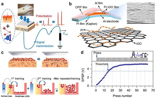 As a derivative of graphene, reduced graphene oxides (rGOs) have the characteristics of controllable defects and adjustable functional groups, which can effectively capture external electrons with nonvolatile electron-trapping characteristics. Wu et al. [50] reported an artificial synapse device based on rGOs, which can realize the typical functions of the neuromorphic system (Figure 11a). The key component of the device uses the hybrid layer of polyimide (PI) and rGOs as the friction layer, and the aluminum (Al) foil electrode is attached to the PI film substrate, the schematic structure is shown in Figure 11b. The rGOs sheets can act as electron traps to effectively promote the charge transfer from PI to rGOs sheets, which play a key role in mimicking the typical functions of the nervous system [96]. When the Al film on the top contacts the friction layer for the first time (i.e., the first training), the electrons are transferred from the Al film to the surface traps in the friction layer (Figure 11c). As the Al film gradually separates from the friction layer, most of the electrons in the surface traps are then transferred to the body traps. In the second training, the electrodes have the same transfer process, which increases the total number of electrons in the body trap. After sufficient training, the number of electrons captured in the body trap reaches the maximum value, which gradually saturates the output voltage of the synaptic device (Figure 11d). From the perspective of bionics, this process is similar to biological excitatory postsynaptic potential. The output voltage not only contains the current press information but also accumulates the historical information of previous stimulations, which can also be treated as the learning behavior of humans. In addition, the stacking structure in the friction layer can effectively regulate the duration time of the information received by the synaptic device, thereby realizing the advanced synaptic behaviors of STM and LTM. This work is significantly different from the above reported synaptic transistor devices. The typical functions of the neuromorphic system can be realized by using the materials with nonvolatile electron-trapping characteristics as the friction layer of TENG, which greatly simplifies the structure of synaptic device and plays an important role in promoting the development of synaptic devices in the future.