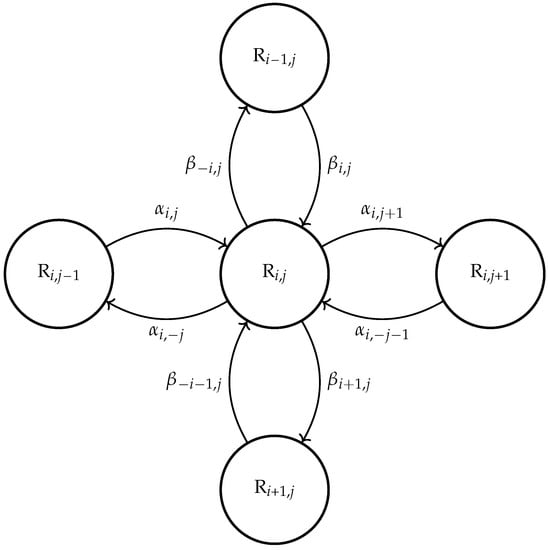 Here, we consider the model (6) in case of , , that is, we have substrate S1 and inhibitor I1. Based on the multi-substrate multi-inhibitor model, we obtain the system of lattice ordinary differential equations including enzymes E = R0,0 and complexes R0,1, R1,0, and R1,1: