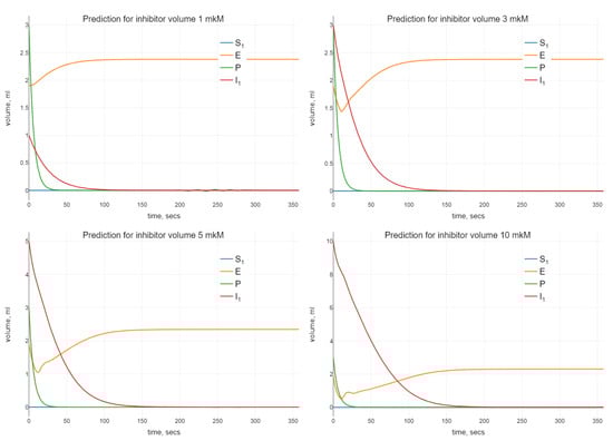 Algorithm 1 was modified for the estimation of the parameters of the model (24). The optimal values of the parameters were used for the simulation using different initial values for the inhibitor. The visualization of the simulations results is presented in Figure 4.
