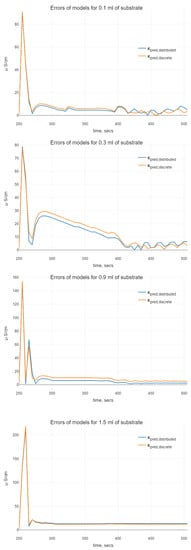 While analyzing the models of (11) and (4), with the help of plots on Figure 3 and Figure 5, we can conclude the following. It is clearly seen that “undesirable” oscillations in the trajectories are appearing at the smaller initial volumes of the substrate. Then, oscillations disappear for bigger ones. There are some differences between trajectories of models with distributed and discrete delay (we mean that the model with discrete delay (4) is constructed for the mean value of delay obtained using the density function , i.e., for ) observable on the plots. Namely, we see differences in the phases of oscillations. Using the distributed delay, the oscillation starts later. Moreover, for the bigger values of initial substrate volume, the oscillations for the distributed delay model disappear (as it can be seen in case of 1.5 mL of substrate). The amplitudes of the oscillations at the smaller values are similar, whereas by increasing the initial substrate amount, the oscillations for distributed delay models are not seen. Hence, when comparing two kinds of delay models, which both demonstrate oscillations in certain sense, we conclude that (11) is more chemically adequate for bigger values of the initial substrate dose than the discrete delay model.