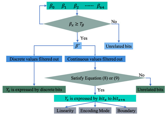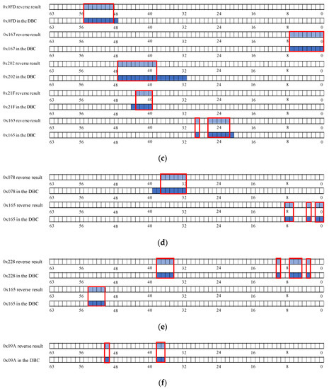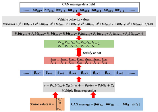 In this stage, the specific details of how the data fields of candidate CAN messages describe the behavior of the vehicle are determined by analyzing the regression coefficient . As shown in Figure 8, the flow of the bit-level reverse for the candidate messages proceeds as follows.