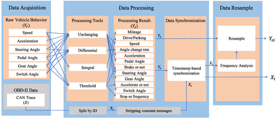 This phase aims to acquire and process vehicle behavior measurements, as well as in-vehicle CAN traffic. The flowchart of this phase is shown in Figure 5, which is mainly divided into data acquisition, data processing, and data resampling.