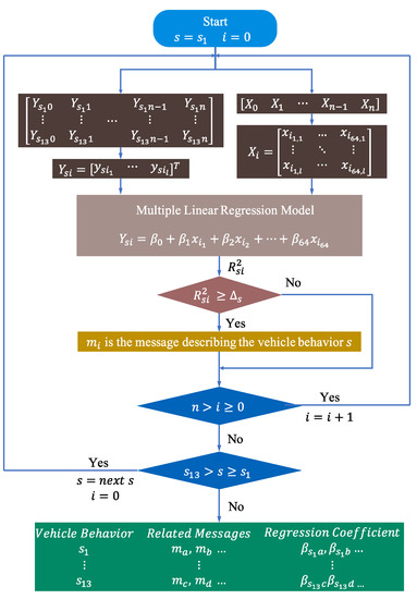 To obtain the relationship between each bit of the data field and the vehicle behavior, this step starts by expanding the data field in in bit form, which is an matrix, where is the number of messages with ID . The dependent variable , which is an matrix, is defined to represent the vehicle state data resampled according to the message dimension, where represents the different vehicle states, . A threshold is defined to filter out the best model. The outputs of this stage are messages and linear regression models that are highly correlated with the individual vehicle behavior data. The flow of this phase is shown in Figure 7. The detailed process is shown below.
