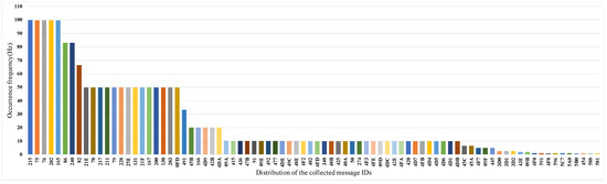 By analyzing the collected CAN traces, the frequency distribution of the messages is shown in Figure 10. This result shows that the number of IDs collected from the test vehicle is 82, which means that there are 82 types of messages in the CAN network. For each type of CAN message, we analyze whether the data field of this CAN message changes and eliminate the messages with unchanged data fields. Based on the analysis and processing of CAN traces, the vehicle behavior data collected in Table 3 is resampled 82 times to obtain . A multiple linear regression model is built between and according to the message filtering process.