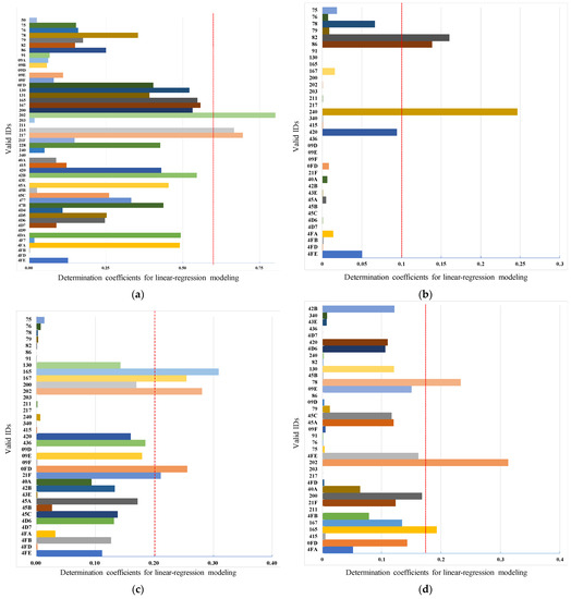 The estimation can be obtained from Equation (5), where is the transpose of . The determination coefficient indicates how well the samples fit the linear model created with and is calculated by Equation (6), where is the estimated with the linear model and is the mean of . The value of is in the range , and 1.0 is the best fit.