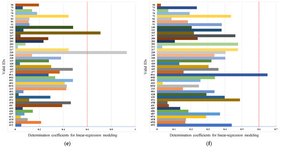 As can be seen from the results of the message filtering, the and threshold values for messages related to steering angle, acceleration, and brake pedal are generally small. This result is due to the slight variations in vehicle behavior when collecting these data. For example, the pedal is unlikely to be located at the lowest position when collecting the gas pedal angle while driving. In addition, the results for vehicle speed, gas pedal, and brake pedal show that a certain number of messages have an value that is below the threshold, but very close to it. Although these messages do not directly describe the state of the vehicle speed, gas pedal, and brake pedal, they do describe vehicle behavior correlated with the state. For example, the near-threshold telegrams in the throttle results describe the vehicle’s speed, torque, and acceleration, among other things. However, since these messages do not directly describe the vehicle speed, they are classified as irrelevant messages by the threshold. Also, as shown in Figure 11e,f, the of the messages related to wiper and gears are clearly distinguished from others. Since the vehicle behavior (gear angle and wiper angle) data and the related CAN messages are all discrete, they can be clearly distinguished from the other messages when the linear regression modeling is performed.