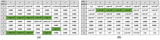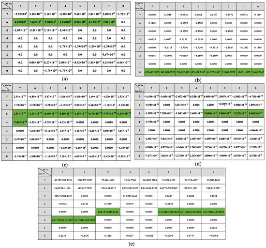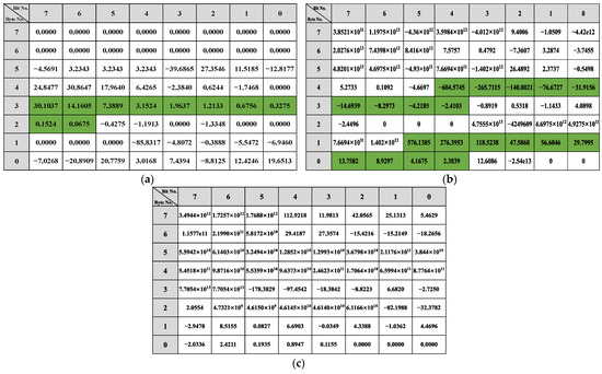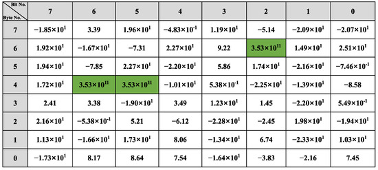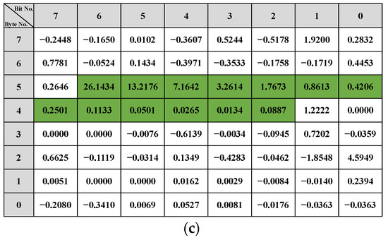 After the related message filtering phase, the most relevant candidate messages for the particular vehicle behavior and the corresponding linear regression models are determined. The linear regression models of and are shown in Equation (7). This result clearly shows the relationship between the vehicle behavior and the data fields of , where represents the linear relationship between this vehicle behavior data and each bit of the message.
