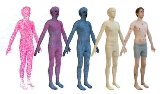 Another important point is that while state-of-the-art measuring systems such as Naked (nakedlabs.com, accessed on 10 December 2021) are already available, they provide an entirely static experience for the user. To make the interaction more immersive and responsive to the user, it is necessary to have a real-time virtual clothing experience.