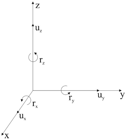 The motion of a particle includes translation, rotation, and deformation. In space, the motion of an arbitrary point can be expressed as three translational components along the axis and three rotational components around the axis (Figure 1) [44]. In the traditional linear elastodynamics theory, the rotational tensor is defined as follows: