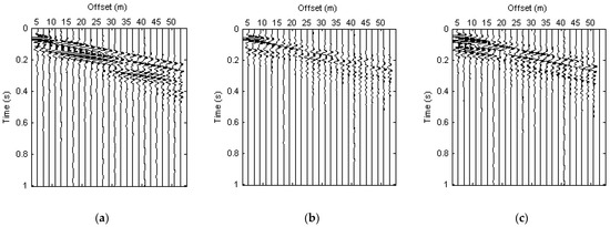 In this paper, the two translational components of surface wave are synthesized by the convolution of the dispersion curves and eigenfunction (modal summation method) [45] with the CPS (The Computer Programs in Seismology) software [46], because the method is based on the analytical solution of the surface wave and the surface-wave fields are considered as pure. Then, the rotational component wave fields are calculated with translational records according to the Formula (2), although the rotational components can be simulated with the finite difference method [47,48]. While in the real data testing, we use the two-point difference method [49] to obtain the rotational component Ry, since the rotational seismometers are not popular and there is usually a lack of rotational observation in the field of engineering seismic prospecting.