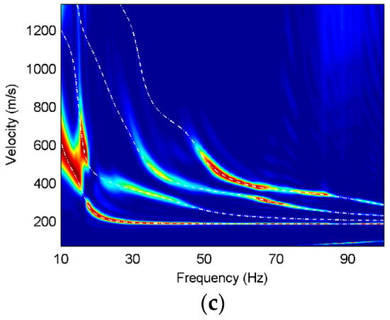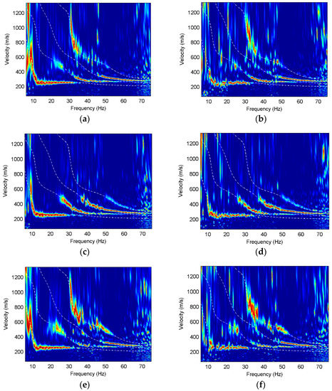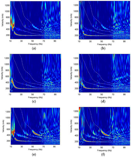 The dispersive energy in the f–v domain can be imaged with the module of the Radon coefficients [14]. Then, the imaged energy is normalized at each frequency, which can remove the effect of the source wavelet spectrum [26].