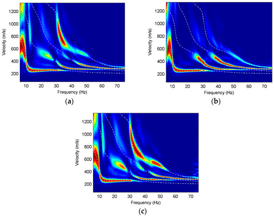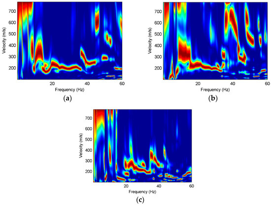 Normalized dispersion images of the field data, where the red color represents the maximum energy. (a) X; (b) Z; (c) Ry.