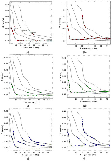 - Zhou, X.H.; Lin, J.; Zhang, H.Z.; Jiao, J. Mapping extraction dispersion curves of multi-mode Rayleigh waves in microtremors. Chin. J. Geophys. 2014, 57, 2631–2643. (In Chinese) [Google Scholar]