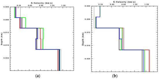 Results of the Rayleigh wave inversion using the radial (red line), vertical (green line), and rotational (blue line) seismic data respectively. The black thick line is the theoretical S-wave velocity, and the black thin line is the initial S-wave velocity. (a) Model 1; (b) Model 2.