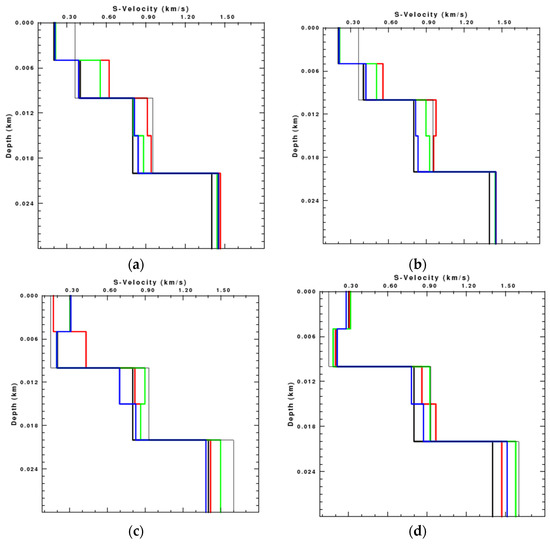 Inversion results of the noisy data using the radial (red line), vertical (green line), and rotational (blue line) components, respectively. The black thick line is the theoretical S-wave velocity and the black thin line is the initial S-wave velocity. SNR of the left column is 2.8 and SNR of the right column is 1.7. (a) Model 1; (b) Model 1; (c) Model 2; (d) Model 2.