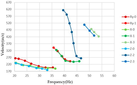 It can be found that the fundamental mode has strong energy on the translational components, but not all higher modes are present on the three components. The first higher mode is dominant on the radial and rotational components, while the second higher mode and the third higher mode are obviously strong on the vertical component. The fundamental mode and the first higher mode on the rotational component have more low-frequency information while the radial component has richer dispersion information at high frequencies, as shown in Figure 13. Furthermore, the vertical component has higher dispersion modes. It can be demonstrated that the translation and rotation are complementary to each other, and more surface-wave dispersion information can be obtained by jointly using the three components.