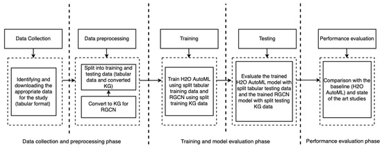 Similarly, during the splitting training and testing data, we split the data into training and testing sets. In this step, we split both the KG and the original tabular data. This is because we also used the H2O (https://www.h2o.ai (accessed on 22 September 2021)) AutoML (https://docs.h2o.ai/h2o/latest-stable/h2o-docs/automl.html (accessed on 22 September 2021)) (Automatic Machine Learning), which provides an automated industrial standard supervised ML algorithm that operates on tabular data [59]. Further, we use it as a baseline for the proposed approach. Section 4.3 provides additional information on H2O AutoML. Further details of the data preprocessing are presented in Section 4.2.