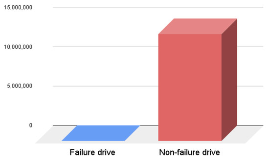 Our study focuses on HD failure prediction and also uses the ML technique. In order to successfully apply the ML technique, we needed to train ML models. To train ML models, we needed data, so the first step was to gather the dataset about HD failure. In our study, we use data from Backblaze (https://www.backblaze.com/b2/hard-drive-test-data.html (accessed on 10 June 2021)) as it offers a real-world HD failure dataset. The dataset contains information about HD failures represented by SMART attributes. In our experiment, we used the dataset from the third quarter of 2020. The dataset contains a total of 106 SMART attributes of which 53 are raw values and 53 are normalised values. The values are stored in 92 different files, which after download are combined into one CSV file. Figure 2 shows the data distribution after combining the data from all 92 different CSV files. The dataset contains a total of 13,553,809 samples, with only 367 samples representing failed HDs.