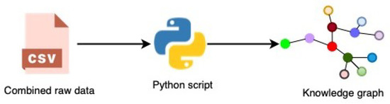 A Python script is used to transform the combined raw data into a KG, which we implemented. For the transformation of raw data into KGs, we followed the principles of RDF Mapping Language (RML) (https://rml.io (accessed on 24 September 2021)). After the transformation, the raw CSV data is saved in CSV format again, but this time in a triple format (subject, predicate, object), denoted by (s,p,o) as shown in Figure 4. However, during our experiment, we observed issues such as being out of memory and slow processing when using the KGs stored in CSV. Therefore, to deal with these issues, we transformed the KGs stored in CSV to NetworkX (https://networkx.org (accessed on 24 September 2021)) representation. The NetworkX representation allowed us to represent KGs as a graph, which can be directly fed to RGCN. Similarly, Figure 5 and Figure 6 show the visualisation of an instance of the created KGs. We have removed the Uniform Resource Identifier (URIs) from Figure 5 and Figure 6 to simplify the visualisation.