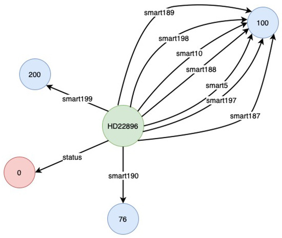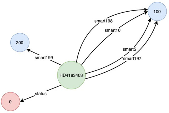 One can observe the difference in the number of relationships and nodes in Figure 5 and Figure 6. This is due to missing values in the original data. In the case of the KG instance depicted in Figure 5, there are no missing values, thus all 10 relationships are present. In addition to the nine relationships discussed before, one extra relationship represents the status of the hard drive based on the SMART attributes value. However, in the KG example depicted in Figure 6, there were missing values, resulting in the absence of some relationships and the corresponding nodes (or tail). This is also an advantage in this case as we can ignore the missing values, which would otherwise have to be filled using imputation techniques.