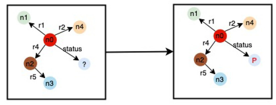 RGCN, which was introduced by Schlichtkrull et al. [55] operates on the relational data, taking directed labelled multi-graphs as input. The V in graph G represent nodes (or entities) , E represents the edge (or relations) represented by the nodes ( of type relation . Graph Convolution Networks (GCNs), which can be thought of as a subset of differential message passing, provide a more accurate representation of nodes by combining connectivity and neighbourhood features, in contrast to DeepWalk or node2vec (https://snap.stanford.edu/node2vec/(accessed on 12 September 2021)), which rely exclusively on connectivity [62,63]. RGCN takes GCN a step further by taking relationships into account while retaining GCN’s advantages, such as advantages of the neighbourhood node. RGCN evaluates Equation (1) while making a neural hidden layer update, wherein denotes a set of neighbourhood indices of node i under relation . The W in the Equation (1) represents the weight matrix and and a problem specific normalisation constant. For details on RGCN, we recommend [55]. Furthermore, unlike GCN, RGCN can deal with heterogeneous relationships [64]. As a result, we consider RGCN in our research.