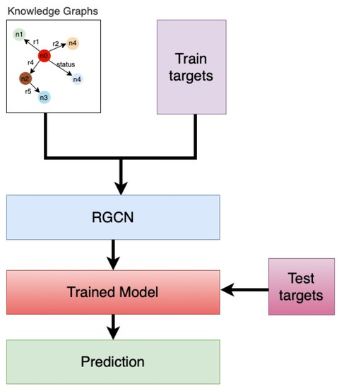 The problem of HD failure prediction can be viewed as a node classification task in our study using RGCN, in which we predict the missing node in a KG. In our case, the missing node includes the HD status “fail” or “good”. Figure 8 shows an example of the node classification. As illustrated in Figure 8, we predict the missing node (denoted by P) by feeding the KG with missing nodes to the trained model. Figure 9 depicts the detailed approach followed in our study. As illustrated in the Figure 9 method, we begin by training our RGCN model with knowledge graphs and train target labels (or train target). The train target labels contain information about HD failures, which is represented as a node in our KG. Similarly, the test target labels (or test target) include data on HD failures information, which we use to validate our trained model, which we present in Section 5.4. We used 70% of the data in our RGCN study as a training set and 30% as a testing set.