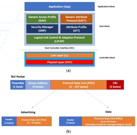 The BLE protocol stack architecture is composed of three blocks (as shown in Figure 1a):