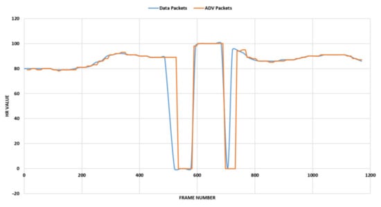 When we inspected the collected packets more closely, the data showed that the device was leaking sensor data through the advertising packets, which contained heart rate data (in hexadecimal format). In addition, the advertising packets were always broadcasted/visible and were not encrypted. We discovered this leakage because the advertising packets contained this extra information, which had no header before the data itself, while the other data in the advertising packets had some header information identifying the data.