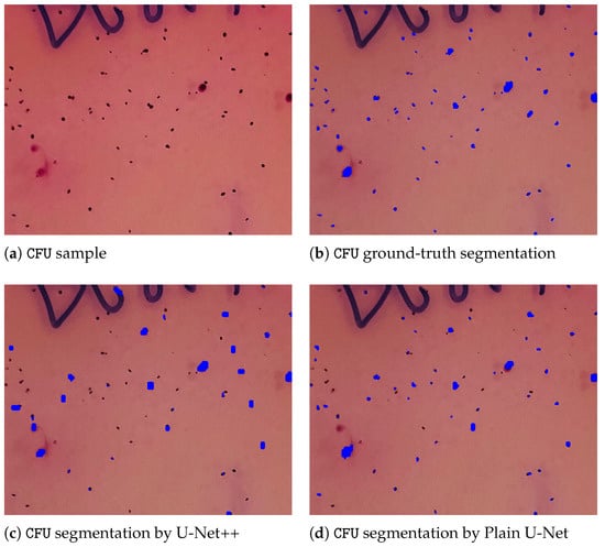 Existing segmentation algorithms—as described in the following sections—are rendered imprecise and unreliable when a colony or a single cell is overly minuscule. Conventional segmentation algorithms, such as region-based segmentation relying on thresholds or edge-based detection relying on the Sobel or Laplacian operator [14] utilize very simplistic concepts. Among these concepts, we can pinpoint the thresholding on gray-scale information or the presence of discontinuous local features in the image where the most significant part of the image changes in local brightness. Compared to a deep learning U-Net model, these approaches can be considered unsupervised and incapable of capturing nuanced discriminatory features of the foreground class. All factors mentioned above undermine the reliability of the existing segmentation approaches among biologists, practitioners, and food safety experts, since these approaches frequently underperform and only allow segmenting out too few or too many objects. Therefore, it is necessary to develop and test new image segmentation approaches, such as enhanced U-Net architectures, which can efficiently recover the very fine details of the foreground class.