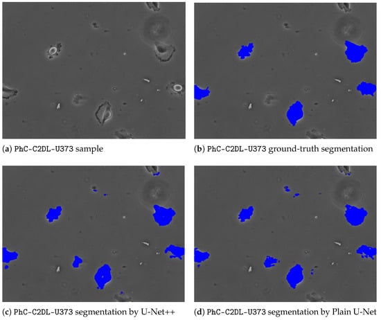 To give further insights and underpin the findings made, a comparative outlook on the CFU segmentation results from all evaluated models on the images with small CFUs is presented in Figure 3. The latter Figure 3 represents a zoomed-in region with small colonies, ground-truth, and different segmentations obtained from all considered U-Net architectures. As it can be noticed, the proposed multi-path U-Net architecture captures CFUs that are either non-detected (by U-Net++, “plain” U-Net) or over-detected (by MultiRes U-Net) in a fine-grained way. Figure 4 presents different model segmentations with high sensitivity to artifacts (e.g., reflections and captions). This figure represents a Petri dish sample with differently sized CFUs along with text and lighting artifacts. As it may be observed, the multi-path U-Net architecture outperforms other approaches on these challenging artifacts as well. Figure 5 presents segmentation results on a very different dataset, namely PhC-C2DL-U373 (glioblastoma-astrocytoma U373 cells on a polyacrylamide substrate). The latter figure contains differently shaped U373 cells as well as some substrate artifacts. Figure 5 demonstrates that the multi-path U-Net model delivers more accurate segmentations and outperforms other approaches. All segmentations presented in Figure 3, Figure 4 and Figure 5 were obtained from the evaluations on the validation dataset.