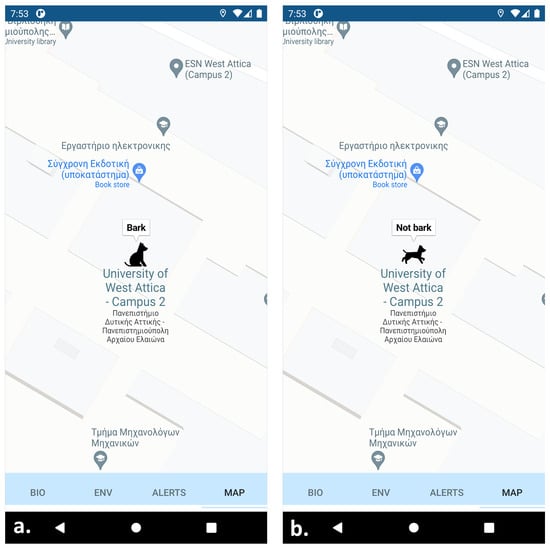 Developed smartphone application displaying SaR dog behavior: (a) canine is not moving and barks; (b) canine is moving and does not bark.