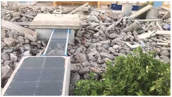 The tests were performed in an arena covered with ruins to mimic a real search and rescue operation as best as possible (Figure 5). The tests included search and rescue missions both during the day and night. In the former case, adequate vision is considered, while in the latter, only limited vision can be attained. The resulting AI algorithms are trained in both cases, as in a real operation both cases can be encountered.