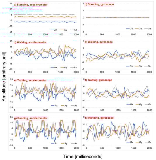 The complete dataset comprises nine dog search and rescue sessions. After the labeling process, each session is segregated in various segments, where each segment comprises only one activity, considering a minimum segment duration of 2 s. Each second of raw data consists of 100 values for the two 3-axial sensors (3-axial accelerometer and 3-axial gyroscope) forming a total of 600 values. Next, each segment is segregated in samples with a 2 s length where a 50% overlap is considered. An example of samples for the four SaR dog activities from both the accelerometer and the gyroscope is illustrated in Figure 7. Evidently, the amplitude of the accelerometer and the gyroscope increase as the activity becomes more intense, which means that the lowest amplitude can be found in standing and the highest in running.