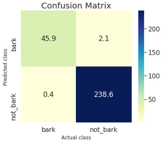 The obtained F1-scores and the corresponding accuracy results are presented in Table 10. The developed deep CNN activity recognition model achieved a F1-score equal to 91.21% and 91.26% accuracy, while the bark detection model acquired 99.08% F1-score and 99.77% accuracy. In particular, the latter provided only two false positives (i.e., the misclacified “not barking” as “barking”), and these, also, triggered the alert notification providing the same F1-score and accuracy metrics for the overall victim detection task.