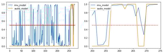 Plots displaying outputs of developed DL models during 275 s of 1st SaR scenario (left). Red line denotes threshold value (i.e., 0.5) for classifying an audio signal as “bark” and IMU signal as “stand”. The final 25 s of this scenario are displayed on (right) plot.