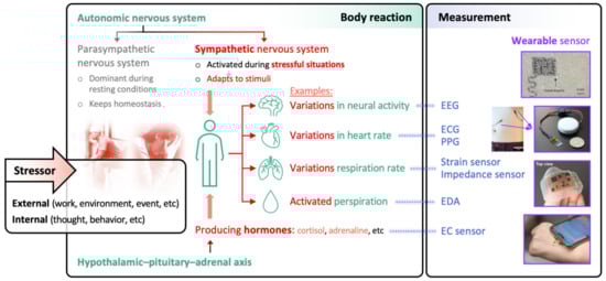 Stress is the response of a human body to stressors, that is, any physical, cognitive, or emotional challenges, to cope with demanding situations (Figure 1). This response is orchestrated by autonomic nervous system (ANS) and hypothalamic–pituitary–adrenal (HPA) axis, which are interconnected []. The ANS has two branches: sympathetic nervous system (SNS) that quickly excites some vital organs (e.g., heart, lungs, sweat glands) and parasympathetic nervous system (PNS) that inhibits such excitation. They complementarily work to modulate vital body functions, maintaining physiological homeostasis. Under stressful condition, the SNS is activated and consequently heart rate increases, respiration rate increases, sweat is secreted, and other physiological systems are affected, which helps the individual to fight against or fly from the challenges. In addition, the HPA axis, which is a hormonal system, is initiated in response to the stressor and drives a series of endocrine events, ending up with the secretion of cortisol. Cortisol affects several physiological systems to support the fight-or-flight response (e.g., by suppressing immune responses and activating metabolisms), and also enhances the SNS-mediated physiological changes. Observing the activities of SNS and HPA axis, therefore, provides the opportunity to access the health status, including mental state.