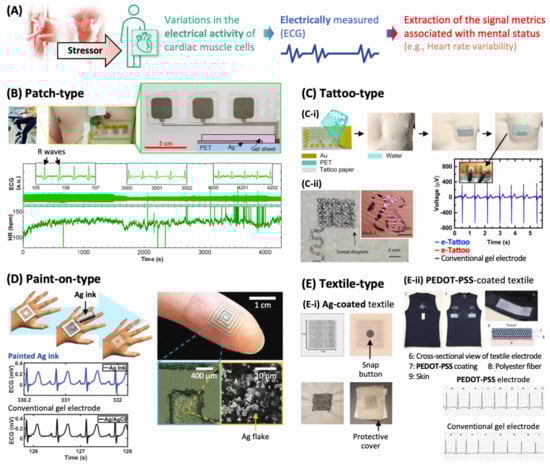 Wearable sensors for monitoring cardiac activities. (A) Mental stress-relevant cardiac activities can be monitored by ECG. (B) Gel electrode patch, (C) e-tattoo, (D) sprayed electronics, and (E) conductive textiles for the measurement of electrical potential generated by cardiac muscle cells. ECG, electrocardiography; PET, poly(ethylene terephthalate); and PEDOT-PSS, poly(ethylenedioxythiophene):poly(styrenesulfonate).