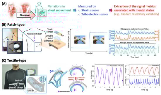 Respiration is regulated by ANS to meet metabolic demands for maintaining physiological homeostasis and to respond to mental stressors [,]. It has been reported that the respiratory patterns, which are characterized by respiration rates, inspiration/expiration ratios, respiratory pauses, abdominal/thoracic respiration ratios, respiratory volume, irregularity, etc., are affected by various mental stressors (e.g., anger, anxiety, depression, fear, and sadness) and are individually specific. For instance, the respiration rate increases when an individual experiences a panic attack and the increment is dependent on the individual’s baseline level of anxiety []. By monitoring respiratory patterns, it is possible to objectively and quantitatively evaluate the mental state. There are several approaches to obtaining respiratory patterns and many of them utilize chest movements during respiration (Figure 3A); this changes the electrical properties (e.g., bioimpedance, not covered in this review) and physical properties (e.g., circumference) of chest region.