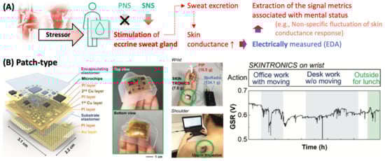 Sweat is a biofluid produced by eccrine and apocrine sweat glands. Eccrine glands are found almost all over the body, with high densities in palms, soles, and forehead, functioning as major sweat glands; apocrine glands are found locally (e.g., armpit). Importantly, eccrine glands are stimulated exclusively by the sympathetic branch, which is activated under stressful situations, of ANS (Figure 4A). The level of sweat secretion, therefore, is an ideal biomarker of SNS activation (and, consequently, of the reaction to stressors).