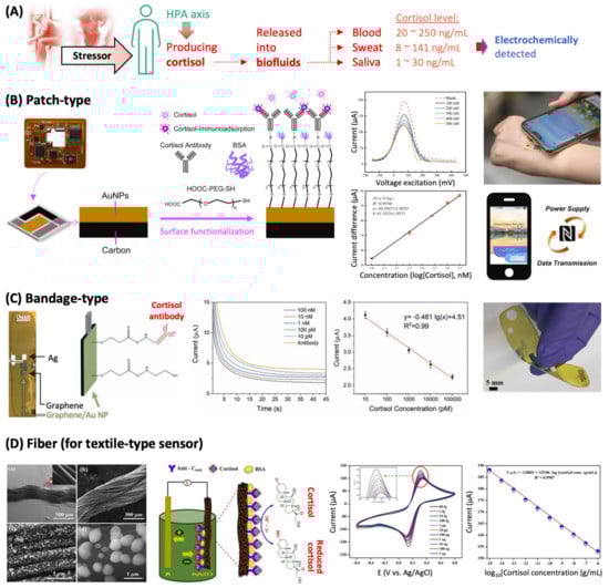 Physiological changes are mediated by specific biomolecule such as ions (e.g., Na+ and K+), hormones (e.g., cortisol and adrenaline), and neurotransmitters (e.g., neuropeptide Y and gamma-aminobutyric acid), and they have been used as molecular biomarkers to examine health status. Cortisol, in particular, has been employed as a stress-related biomarker. It is a hormone that is released from the adrenal cortex and reaches multiple body fluids, which is triggered by the stimulation of the HPA axis, the endocrine core of stress system (Figure 5A). Cortisol secretion temporarily increases the availability of energy by affecting muscle strength, memory function, immunity, and the sensitivity to pain to cope with stressors []; this increased cortisol secretion is terminated via a feedback-loop to maintain homeostasis of the body functions. The abnormalities of HPA axis result in hyper- and hypocortisolisms, and it has been revealed that such dysfunctions are connected with mental illnesses such as depression and post-traumatic stress disorder, respectively []. Therefore, by monitoring the level of secreted cortisol, it is possible to obtain some information on metal state.
