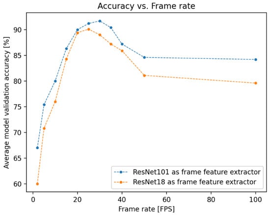 For the flow-regime classifier and vapor quality estimator, videos were recorded at frame rates of 30 FPS and 10 FPS respectively, with these values arising as the optimal frame rates for their specific tasks from a hyperparameter search. The results of this search for the flow-regime classifier are depicted in Figure 1. Lower frame rates allow a longer video clip in the temporal dimension to be processed over a smaller number of frames, but if these rates are too low (as seen for the flow regime classifier, at rates below 20 FPS in Figure 1), temporal aliasing might make it difficult for the LSTM network to extract useful temporal features between frames. If the frame rate is too high (as is the case for the regime classifier for rates above 40 FPS), the time between frames is too short for useful temporal features to be learned by the network.