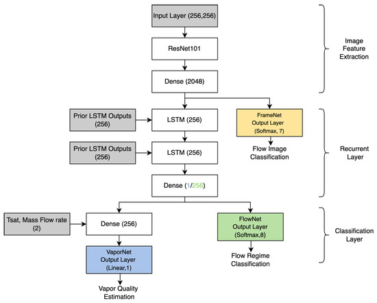 The network architecture of the flow regime classifier (FlowNet), as described in Figure 3, is made up of three components, with the data path for the network flowing downwards. The input to the system is an image from a sequence of frames, and the output is a flow regime class prediction. A vapor quality regression network (VaporNet) is implemented by adjusting the classification layers of FlowNet.