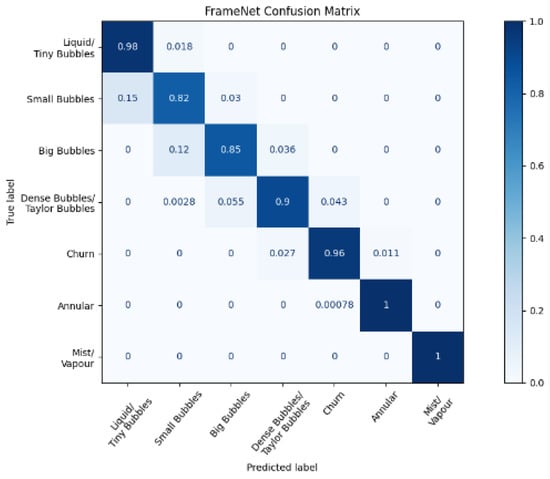 Table 2 shows that the accuracy of FrameNet is high across its models. Although the prediction accuracies of FrameNet are mostly consistent across classes, there are certain frame classes that produce a disproportionate number of classification errors, with these misclassifications occurring mainly between neighboring classes, as seen in Figure 6. Most of these incorrect classifications occur between the Small Bubbles and Big Bubbles classes; this may be due to the similarity between the image features found in these classes, due to the similarity in the bubbles: both classes have nearly spherical bubbles with only minor deformations in their shapes. This issue of similar features being found in images existing in different classes might also extend to the classification of a sequence of images, potentially causing confusion between the churn and annular FlowNet classes. Another possible cause for the above confusion is the introduction of errors in the FrameNet data labels by the manual labeling of training and test data.