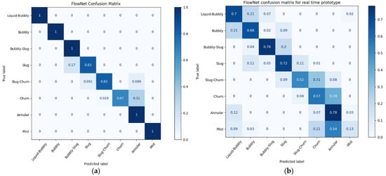 Normalized confusion matrices for FlowNet: (a) during offline testing; (b) during online testing using the experimental prototype.